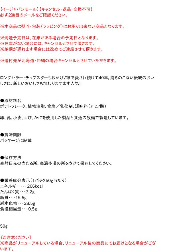 [関連キーワード:お菓子 ポテト フレーク スナック ポテチ うす塩 ロングセラー 40年]まとめ買いはコチラ(激安ケース) >>【イージャパンショッピングモール】内のみのお買い物は、送料一律でどれだけ買っても同梱する事が出来ます。